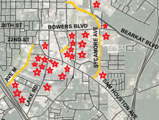 SHSU has 21,000 students, with all but the freshmen living off-campus. A thick cluster of apartments along Lake Rd. houses over 3,000 students, with concentrations along Sycamore Ave., Montgomery Rd., and I-45 holding thousands more.