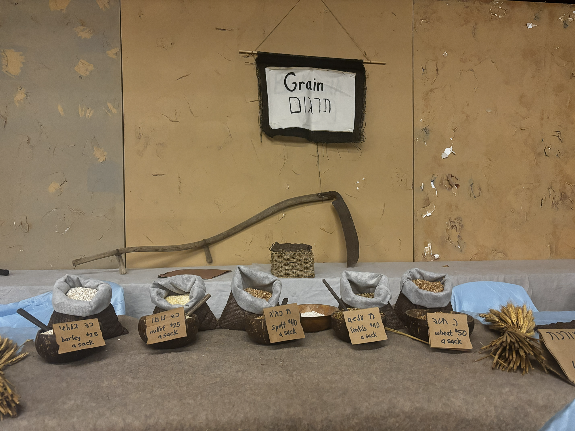 Clockwise from top left: the grain shop, soldiers guarding the entrance to King Herod's court, the spice shop, and two shepherds with their goat.