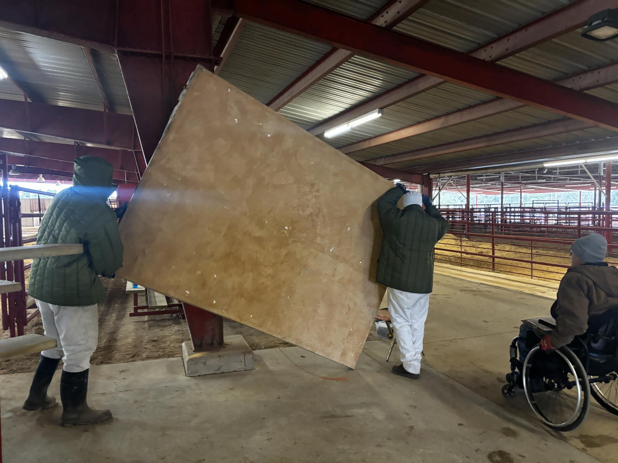 Several people supervise the trusties, including David Blaylock, who is as adept at maneuvering his wheelchair as he is at construction. He darts about the unpaved floors of the fairgrounds organizing the assembly of the town.