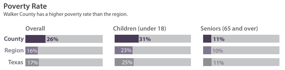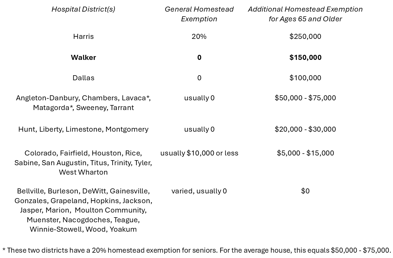 In contrast, smaller counties like Walker have much less taxable commercial and industrial property, so homestead exemptions are usually small (except for the schools, which are set statewide). As a result, the Walker County Hospital District's exemption is almost surely one of the largest in the state.