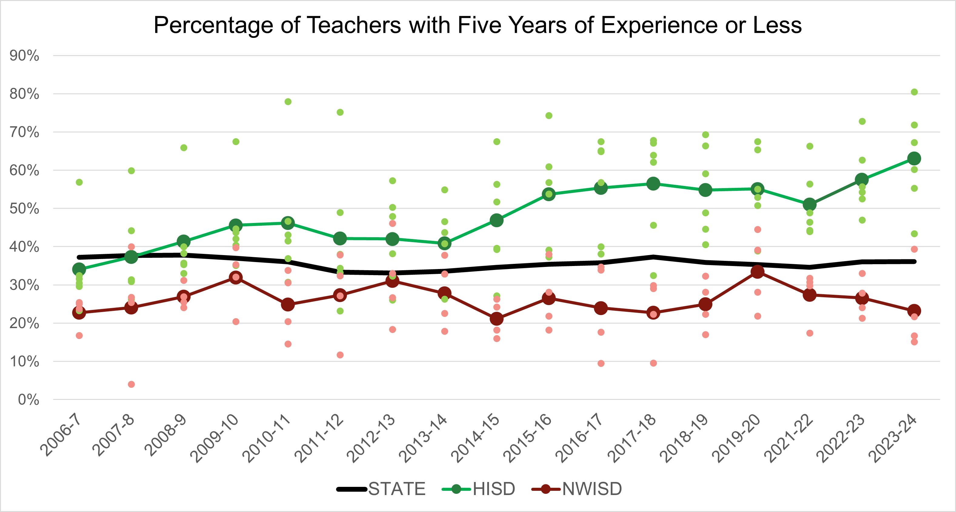 But in Huntsville, things have changed. The percentage of inexperienced teachers started rising after the 2006-2007 school year, soon surpassed the state average, and has grown steadily ever since. By 2023, it exceeded 60%.