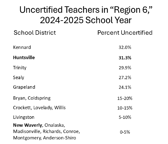 Most local school districts are either near that 12% range (Coldspring, Crockett, Willis) or below it (Conroe, Madisonville, New Waverly, Richards). But in Huntsville, the fraction of teachers that are uncertified has shot up to 31%, the second highest rate of all 55 districts in our educational "region."