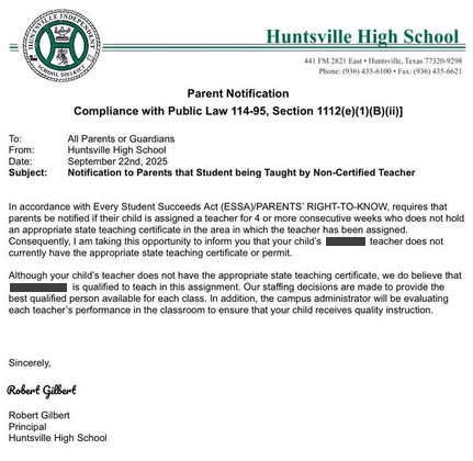 Huntsville High School sent one letter after another – four in all. Each said the same thing: "I am taking this opportunity to inform you that your child's teacher does not currently have the appropriate state teaching certificate."