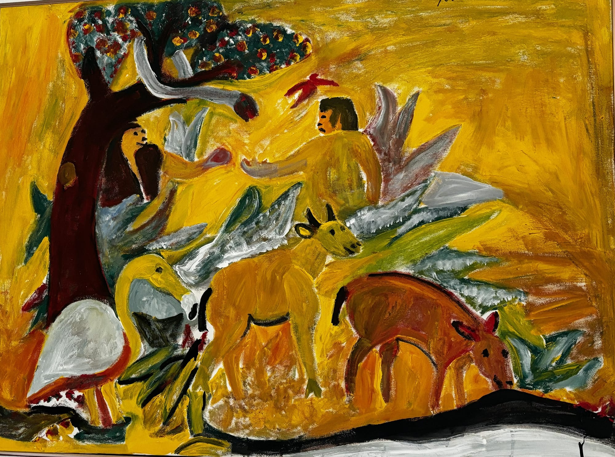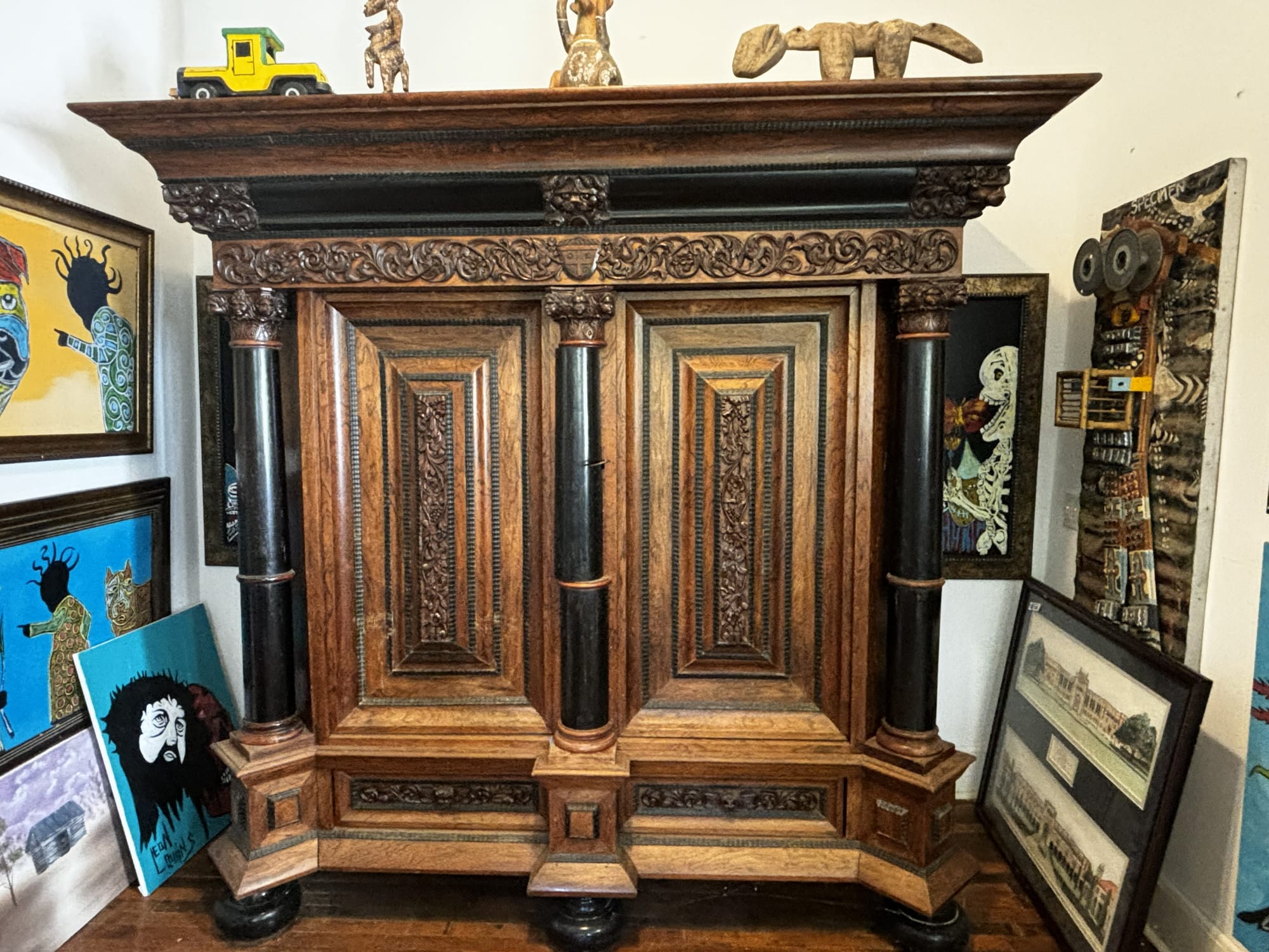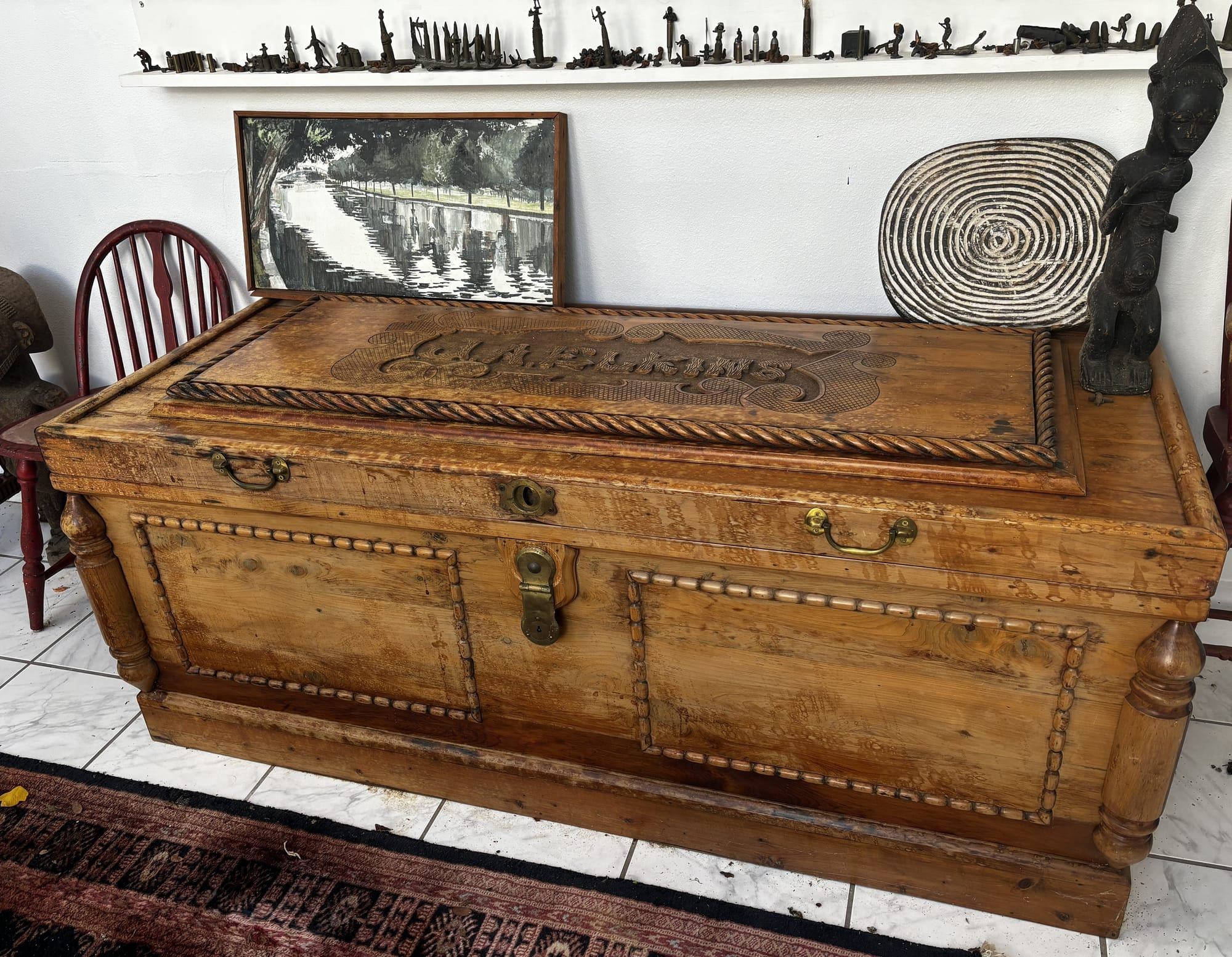 Jude Elkin's cedar chest and close-ups of two paintings by Johnnie Swearingen. Photo credits: Mary-Brett Stringer.