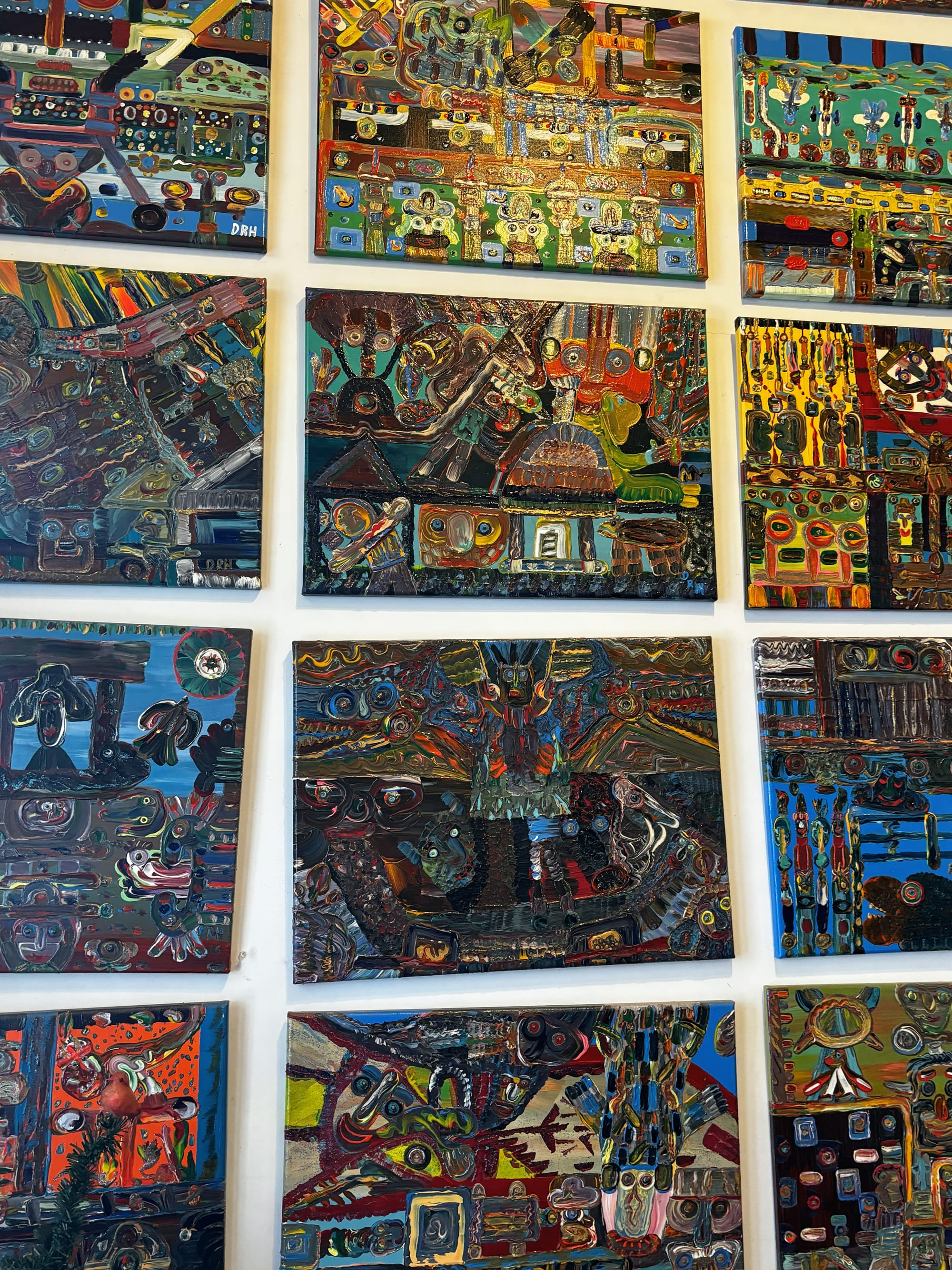 Clockwise from top left: A wall of paintings by Dennis Hickman, and paintings by Leon Collins and Bill Haveron. Photo credits: Mary-Brett Stringer (left, right), John Stipe (center).
